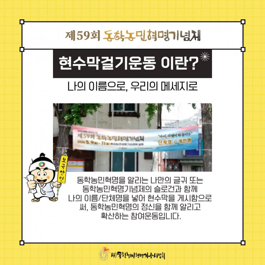 | 제목 | 2026년 제59회 동학농민혁명기념제 현수막걸기운동 안내 | ||